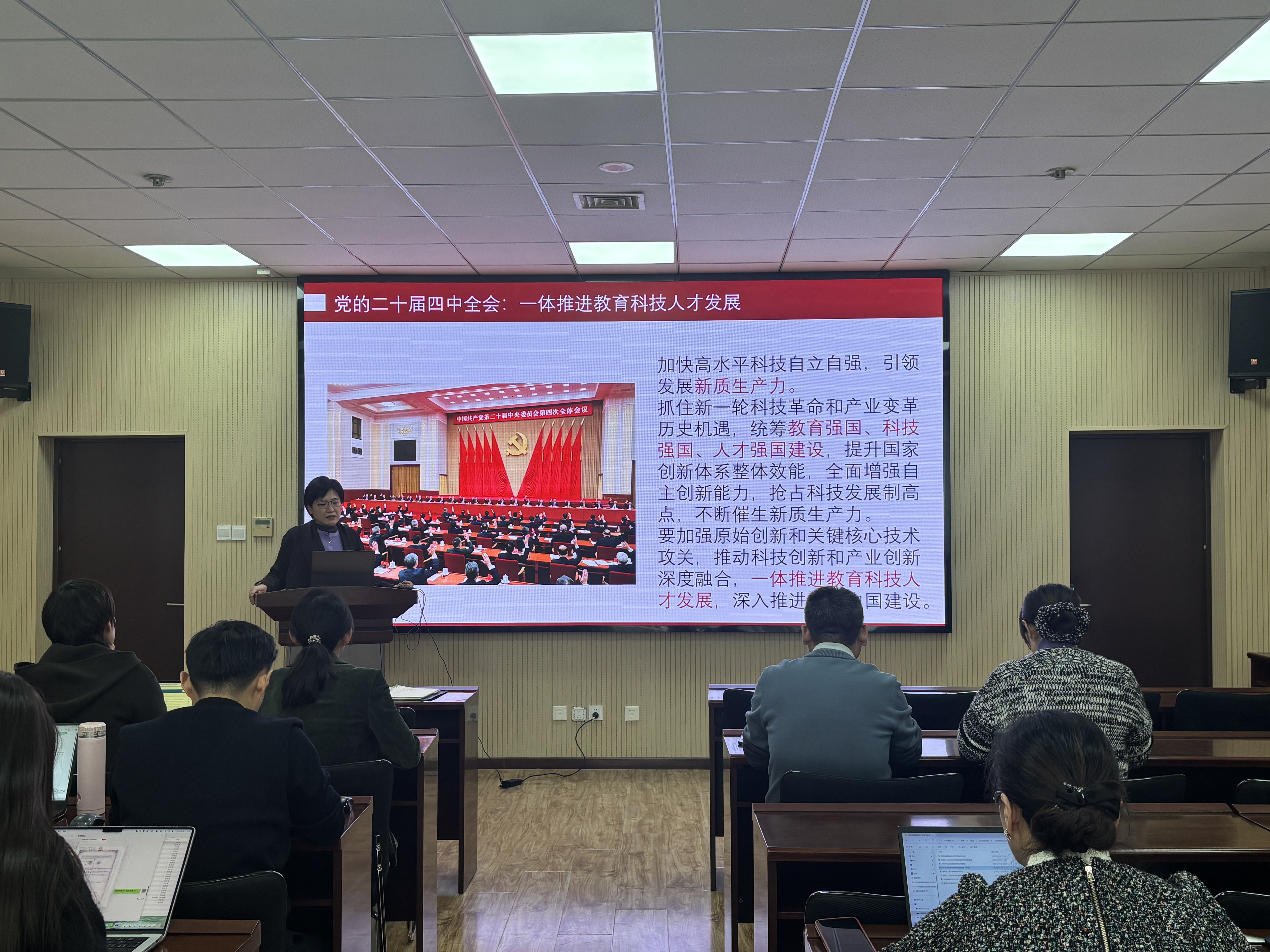 会上,张玉将全会精神学习与学院正在开展的课程思政专题培训深度融合,聚焦“为党育人、为国育才”的初心使命,深入阐释了课程思政建设的必要性和方法论。她引用“盐溶于汤”的生动比喻,明确价值引领应如盐之入味,自然融入专业知识传授全过程,实现“润物无声”的育人效果。全体教师要深刻把握教育的政治属性、人民属性和战略属性,深挖各类课程中蕴含的思想政治教育资源,找准专业教学与价值引领的契合点,做到适时、适量、适度地融入,实现知识传授、能力培养与价值塑造的有机统一,切实提升育人实效。