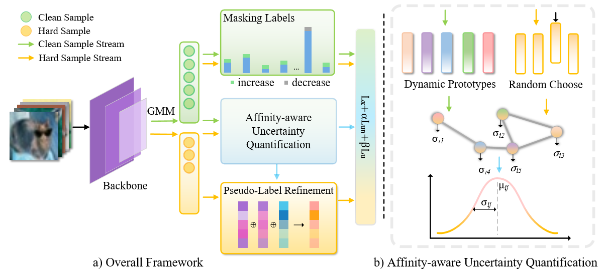 论文概述:现有的噪声标签学习方法往往会忽略固有噪声(例如样本质量)的影响,这些噪声可能误导 DNNs 关注不正确的区域,损害 softmax 分类器,并生成低质量的伪标签。该论文提出了一种新颖的亲和力感知不确定性量化框架,通过量化不确定性来探索感知模糊性并纠正显著性偏差。此外,文中设计了一种不确定性感知损失函数,以强调从这些高不确定性样本中学习,这有助于 DNNs 逐渐将注意力集中在关键区域。论文进一步利用样本-原型亲和力来自适应地细化伪标签,从而提高噪声样本监督信号的质量。在多个数据集上的实验表明本方法优于目前的大部分噪声标签学习方法。