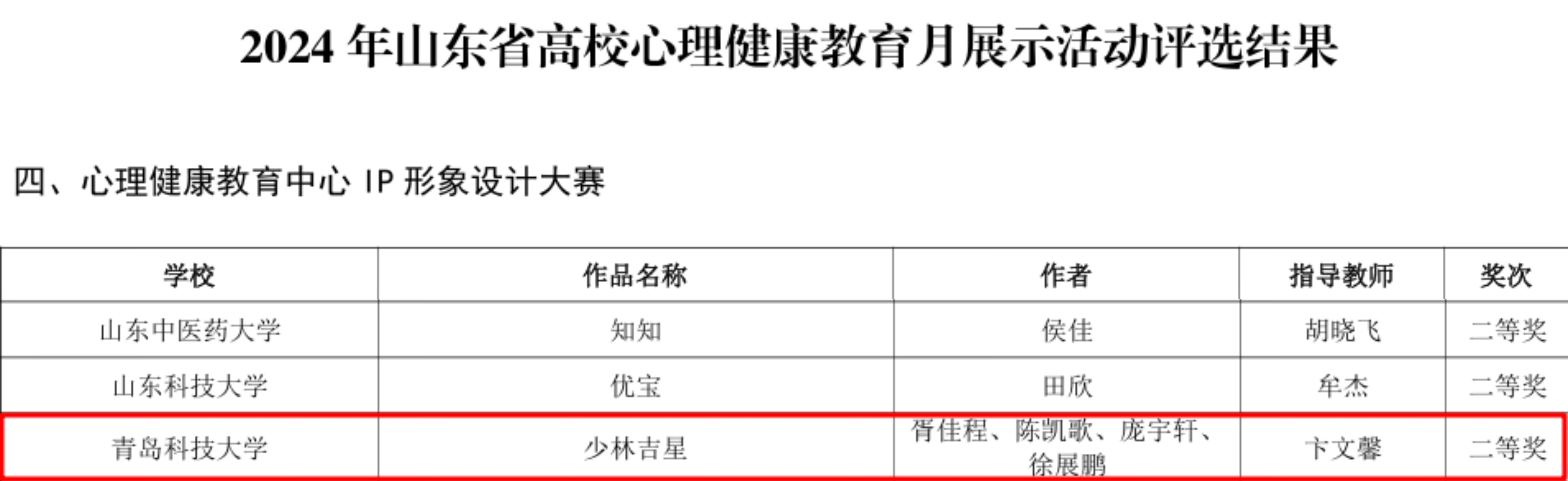 近日,山东省高等学校思想政治教育研究会、大学生心理健康教育专业委员会公布了2024年山东省高校心理健康教育月展示活动评选结果,澳门十大信誉好的网站《少林吉星》获得心理健康教育中心IP形象设计大赛二等奖。