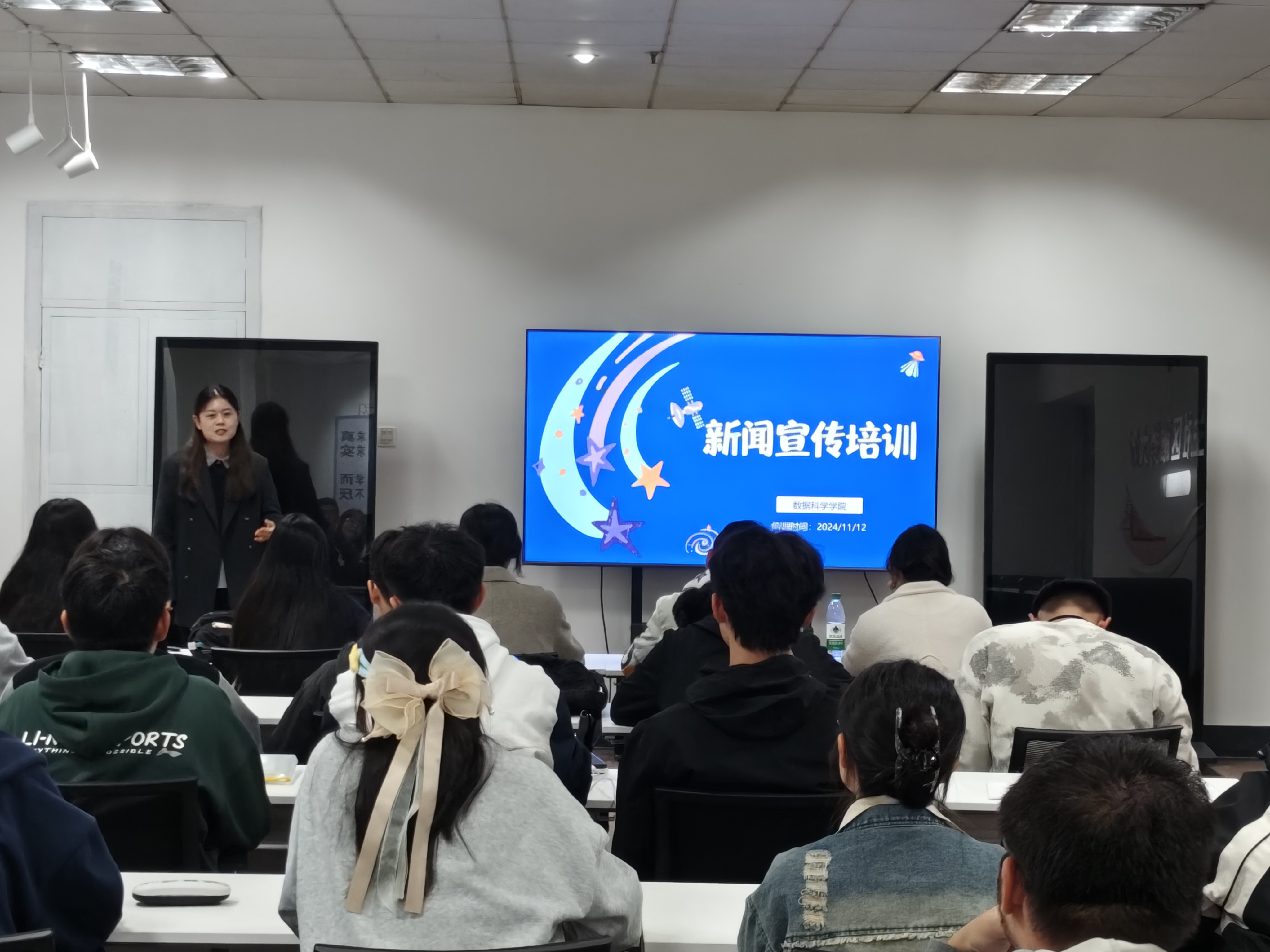 11月12日,澳门十大信誉好的网站于崂山校区“一站式”学生社区服务中心学业发展中心举办“数智·星辰”之新闻宣传培训主题团课,学院辅导员、宣传干事卞文馨担任主讲人,三十余名学生参加活动。