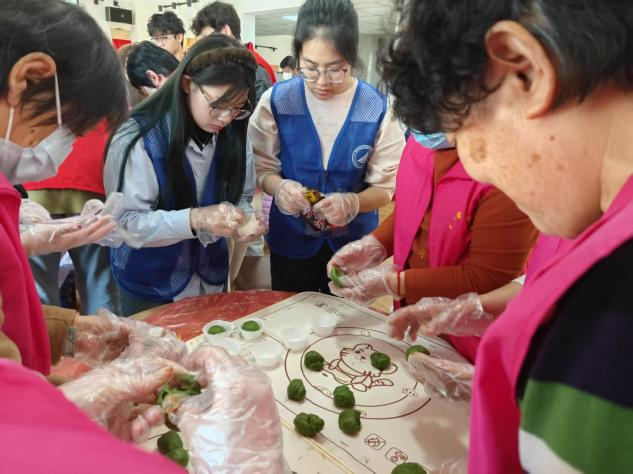 活动现场气氛热烈,志愿者与社区居民们齐心协力,共同制作青团。他们将翠绿的艾草汁与洁白的糯米粉充分融合,经过揉面、塑形、包馅等传统步骤,一颗颗饱满圆润、散发着艾草清香的青团逐渐摆满桌面。活动过程中,大家相互交流、互相学习,欢声笑语不断,现场洋溢着浓厚的节日氛围。