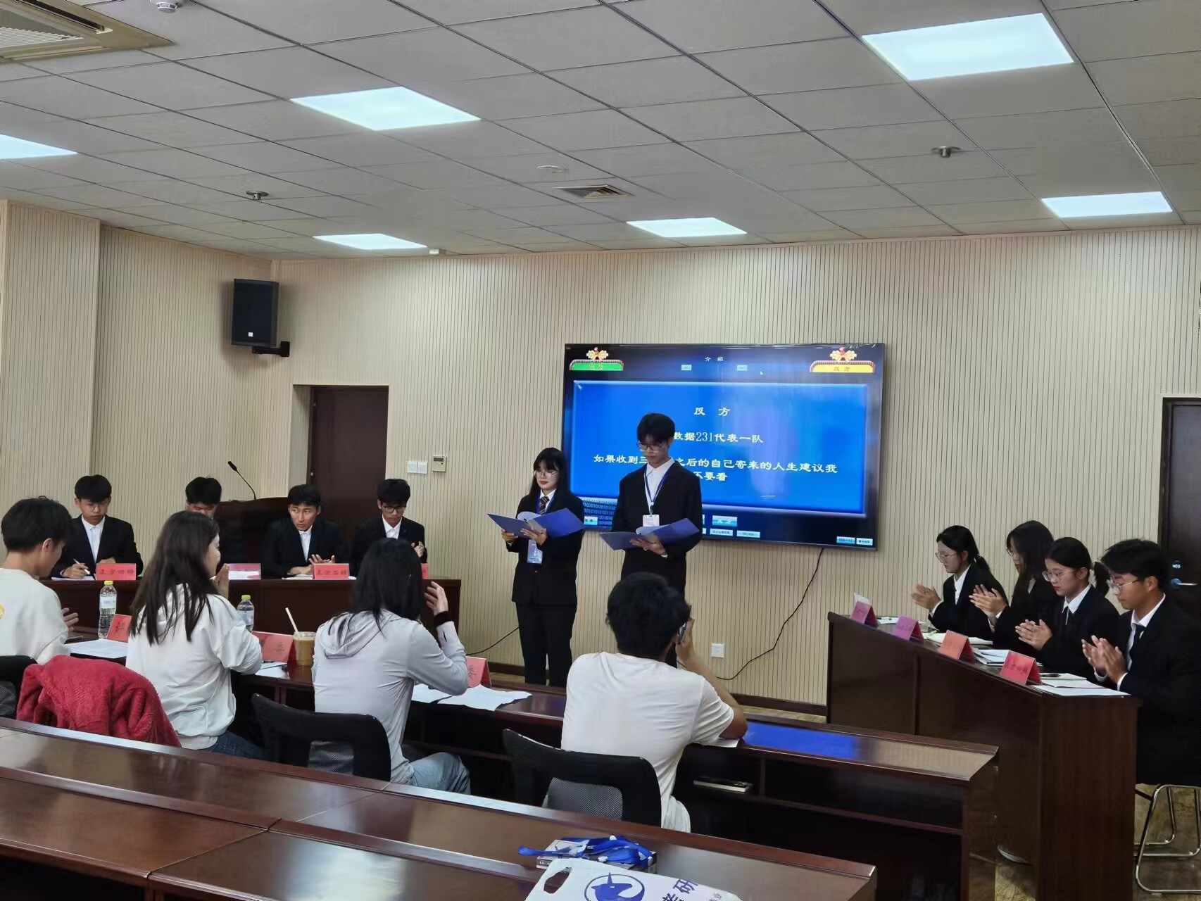 经过前期比赛的选拔,最终进入决赛的代表队为正方人工智能232代表一队和反方大数据231代表一队。辩论赛共分为开篇立论、驳论及对辩、盘问及小结、自由辩论以及总结陈词五个环节。双方辩手自我介绍完毕后,双方开始围绕“如果收到三十年之后的自己寄来的人生建议,我要不要看”展开辩论。