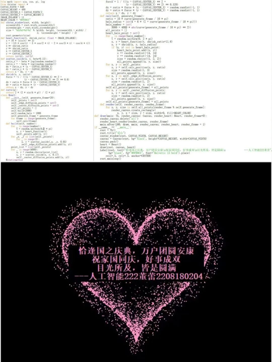 此次活动,学院广大学子积极响应,用“三行代码”谱写出独属于理工科的浪漫情诗,深情告白祖国。这彰显了同学们的专业技能与特色,同时用三行代码浪漫地诉说“生在红旗下,长在春风里”的骄傲与自豪。数科学子通过这别开生面的表白方式,向祖国献上了最真挚的祝福与热爱:愿山河无恙,祖国繁荣昌盛。