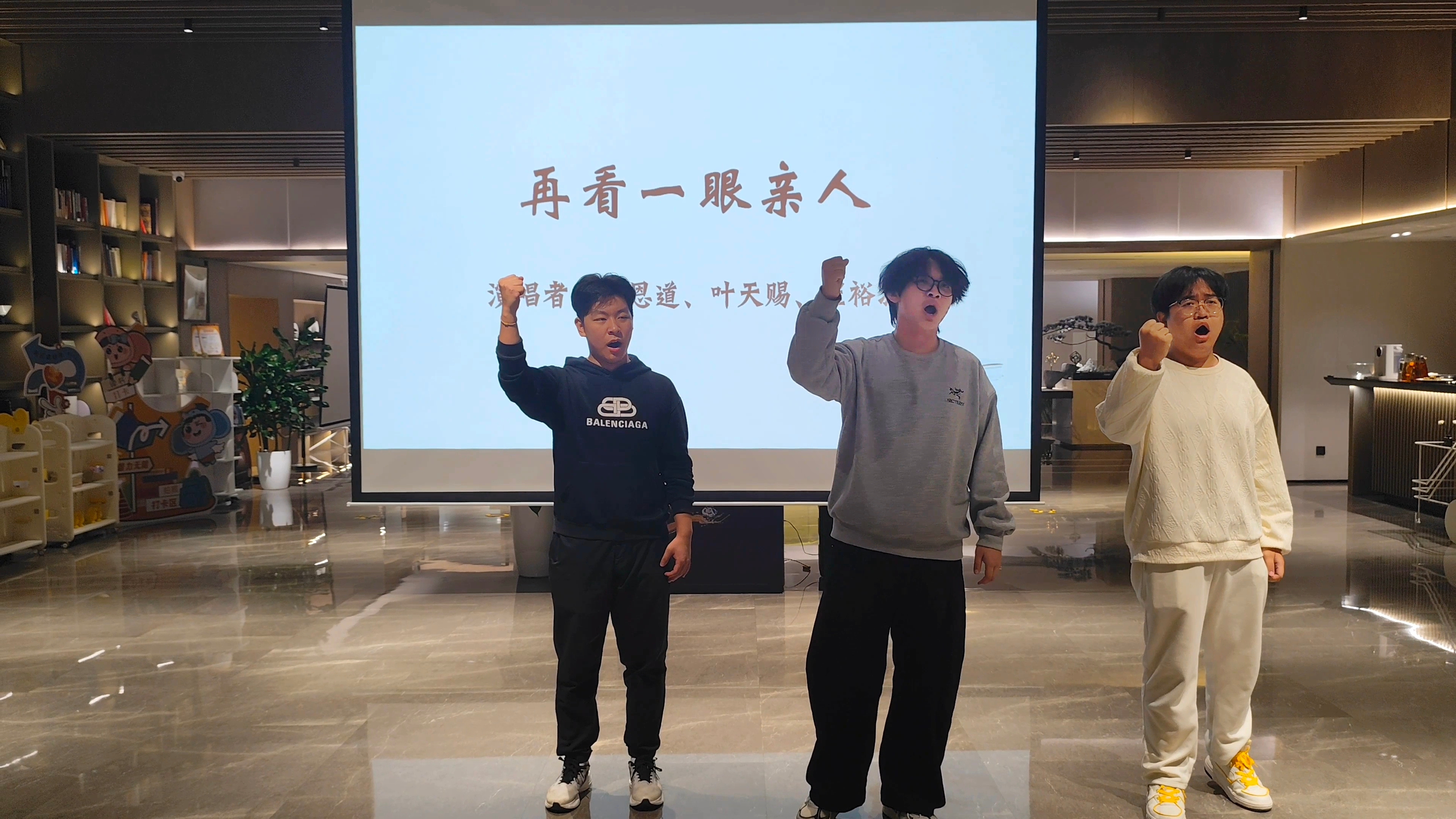 分享环节后,艺术学院叶天赐、崔裕源、张恩道登台演唱《松花江上》《再看一眼亲人》《这份恩情报不完》,深情的演唱为活动增添了浓厚情感氛围。