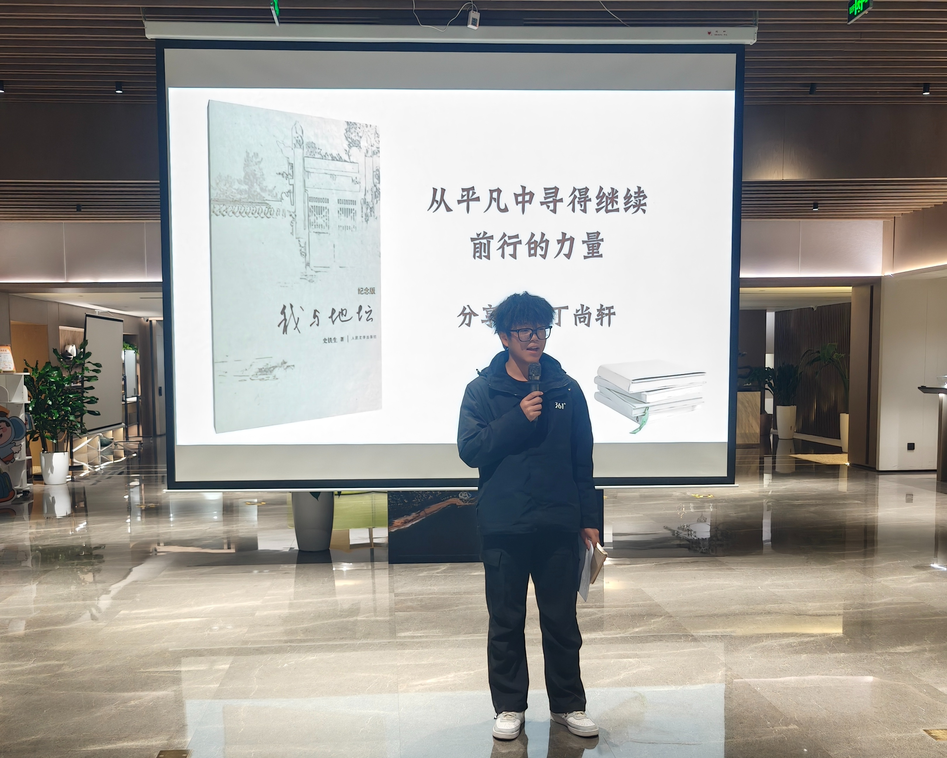 人工智能251班丁尚轩以“从平凡里寻得继续前行的力量”为题,分享《我与地坛》,借史铁生地坛经历,阐述困境中可从平凡事物汲取力量、重拾勇气的感悟。