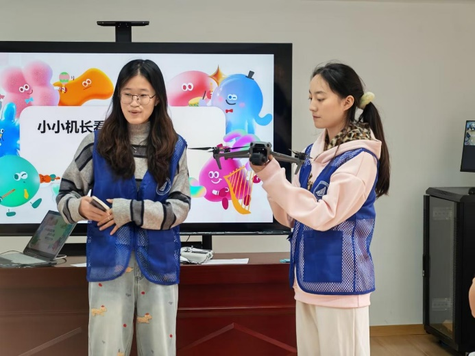 依托学院专业优势,志愿服务团队同步开展科技科普实践。志愿者结合无人机模型,系统阐释其工作原理及在农业植保、应急救援、环境监测等领域的应用价值,细致解答小朋友提出的技术疑问,并进行现场操作演示,让抽象的科普知识转化为可感可知的直观体验。