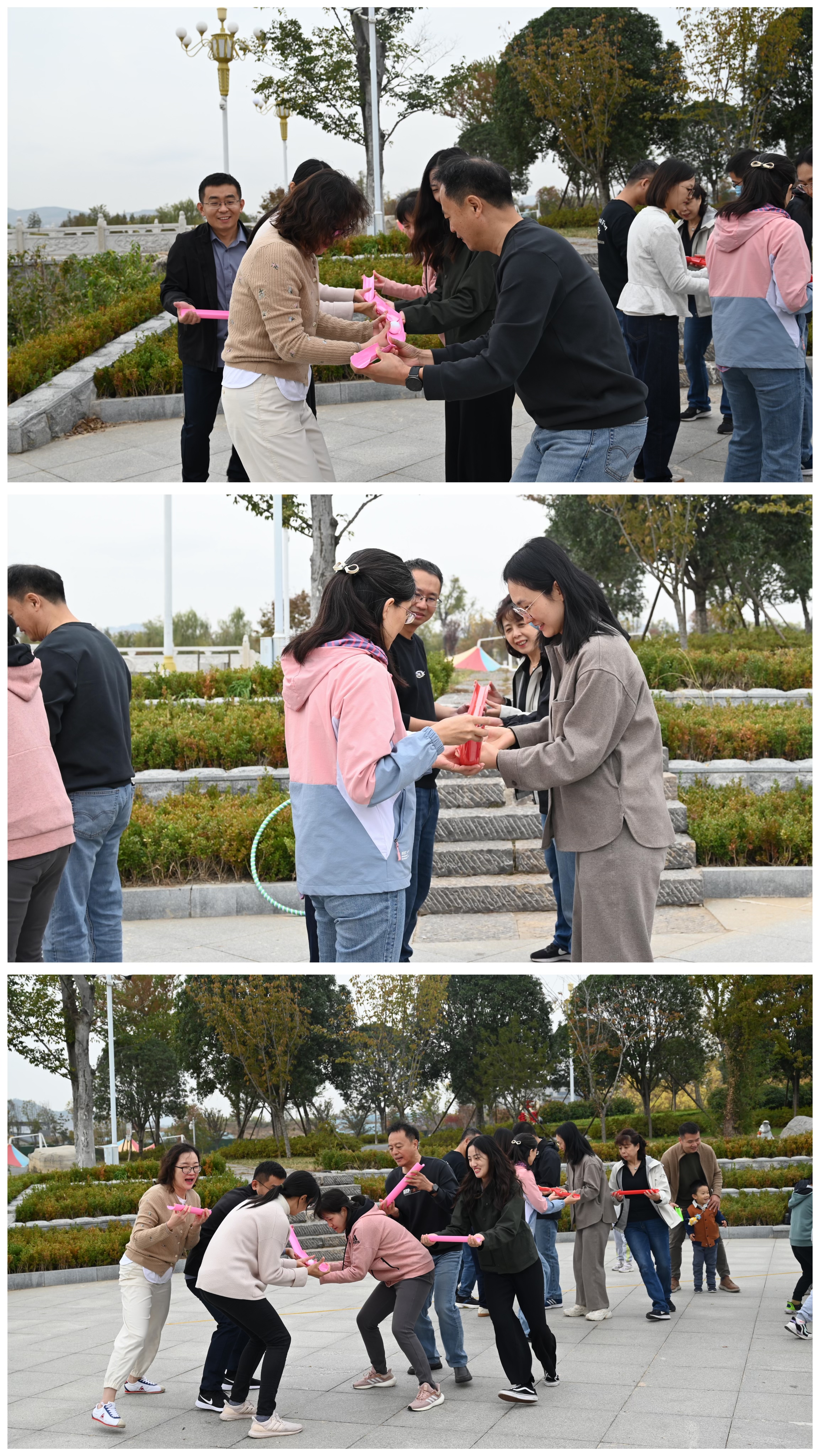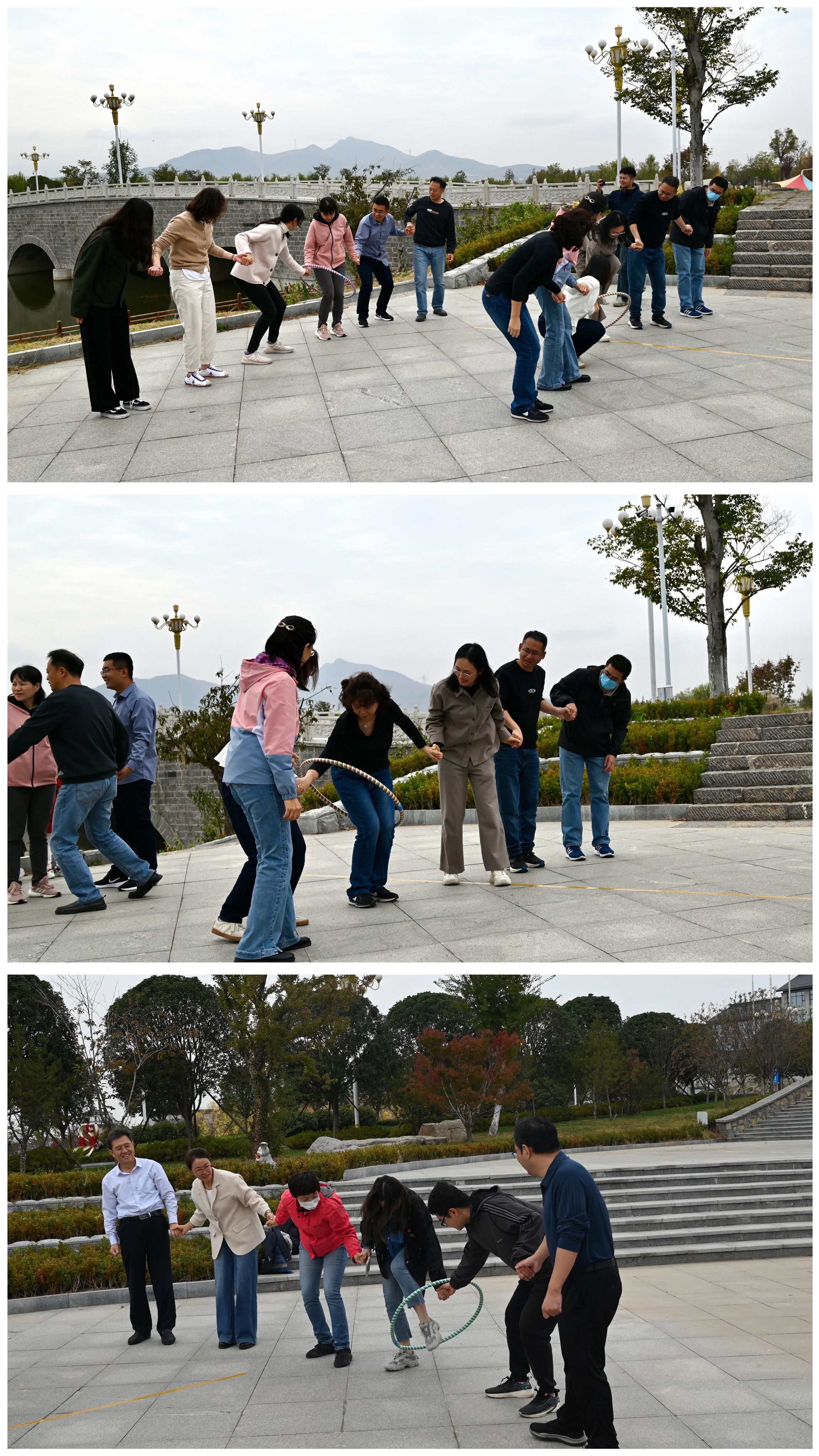 “环环相扣”则考验团队协作能力,大家手牵手,将呼啦圈穿过全组人的身体。