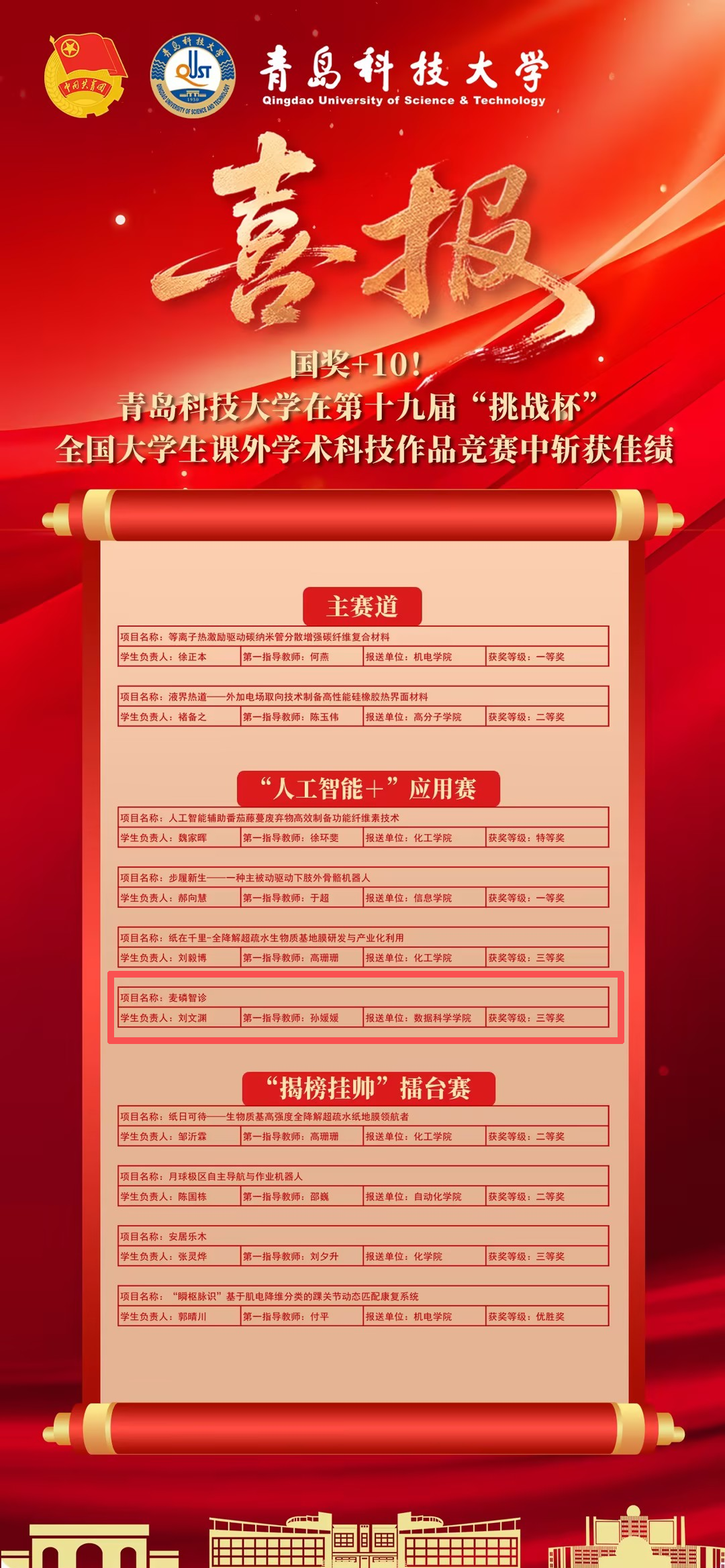 10月31日至11月3日,由共青团中央、中国科协、教育部、中国社会科学院、全国学联和江苏省人民政府共同主办,南京大学承办的第十九届“挑战杯”全国大学生课外学术科技作品竞赛终审决赛在南京大学仙林校区举行。澳门十大信誉好的网站参赛项目“麦磷智诊”(学生负责人:刘文渊,第一指导教师:孙媛媛)斩获“人工智能+”应用赛三等奖。