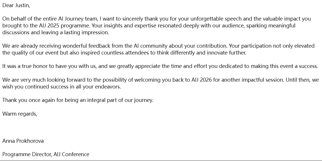 会议组委会主席Anna Prokhorova在会后发来感谢信,充分肯定王殿辉教授的学术贡献。她表示,王殿辉教授的演讲“提升了大会学术质量,激发了与会者的创新思考”,并诚挚邀请其继续参与2026年会议,持续深化双方合作。