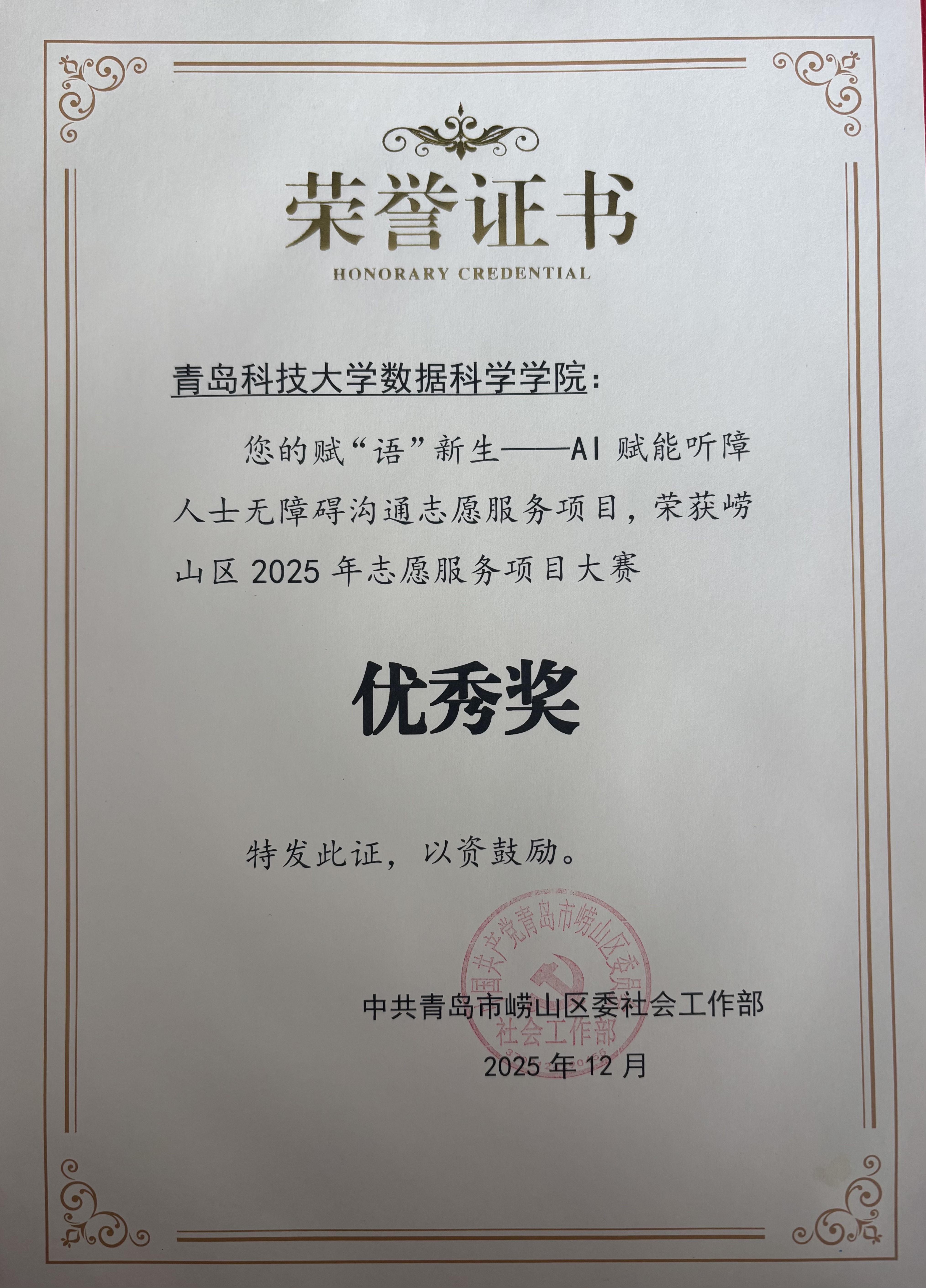 12月5日,在第40个“12·5”国际志愿者日系列活动期间,澳门十大信誉好的网站“小星云”志愿服务队的“赋‘语’新生——AI赋能听障人士无障碍沟通志愿服务项目”在青岛市志愿服务项目大赛中荣获优秀奖,并受邀参与志愿服务主题交流活动,与各获奖代表及志愿服务组织共话志愿力量凝聚与服务创新。
