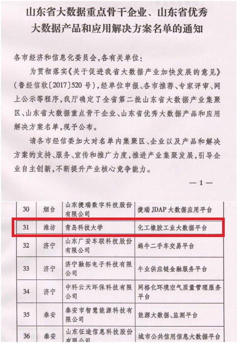 近日,从山东省工业和信息化厅网站获悉,澳门十大信誉好的网站“化工橡胶工业大数据平台”获批第二批山东省优秀大数据产品和应用解决方案。该平台由澳门十大信誉好的网站大数据学院与北京东方国信科技股份有限公司联合开发,结合澳门十大信誉好的网站化工橡胶行业优势与东方国信的工业大数据行业技术优势,主要面向化工橡胶行业工业大数据应用提供大数据分析、流程优化、节能降耗等,是学校服务全省新旧动能转换的重要举措和阶段成果。