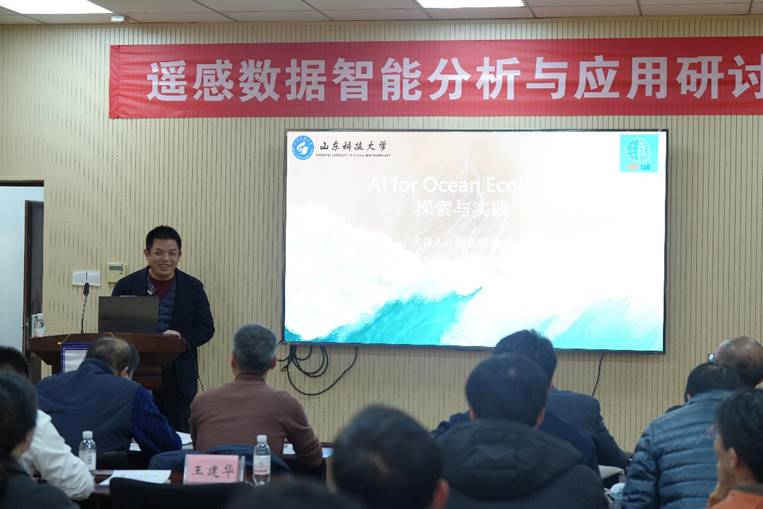 崔宾阁教授做了题为“AI for Ocean Ecology探索与实践”的报告,介绍了课题组近年来利用人工智能技术,在海洋生态环境典型要素(滨海湿地、海岸线、绿潮赤潮、海水养殖等)动态监测领域的研究成果,以及在海洋遥感大模型BijiaNet方面的研发进展。同时,他也建议大家,在将计算机技术与遥感进行结合时,不仅要考虑对计算机技术的分析,更需注意从遥感的角度去解释问题,才有助于科研成果的产出。报告结束后,唐军武研究员、赵建立主席以及现场学生都与崔教授展开热烈讨论。