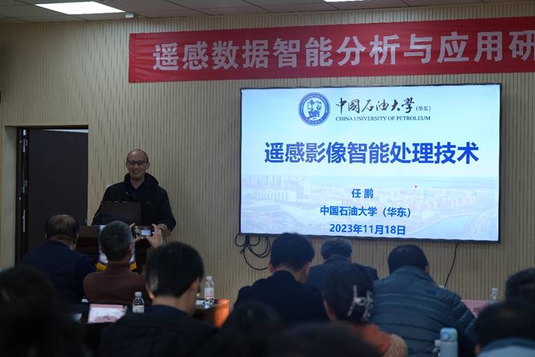 任鹏教授做了题为“遥感影像智能处理技术”的学术报告。围绕团队最新研究成果:互导学习模型和哈希定位算法,介绍了互导模型在高光谱影像分类、遥感影像薄云去除、海冰分类等问题中的应用,以及如何利用哈希定位解决遥感大尺度影像中特殊场景快速定位问题。两类方法体系将分别推动遥感影像处理朝更准和更快的方向发展。报告结束后,任鹏教授与张浩老师、及现场研究生展开了广泛讨论。