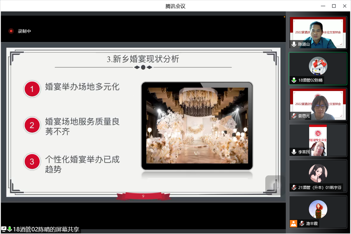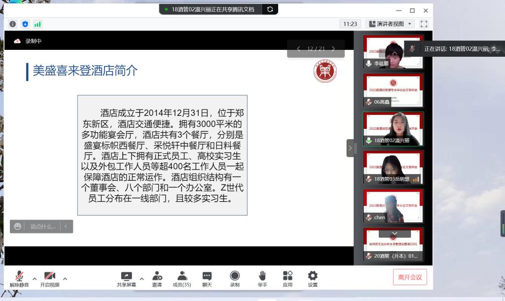 为切实保障本科教学质量,最大限度降低疫情对学生毕业的影响,5月21日,beat365在线体育官网登录入口2022届酒店管理本科专业顺利完成187名毕业生毕业论文答辩工作。本次答辩师生全部通过腾讯会议采用线上方式进行,分为7个答辩组,院长王德静、副院长王中雨等42位教师参与全程答辩。