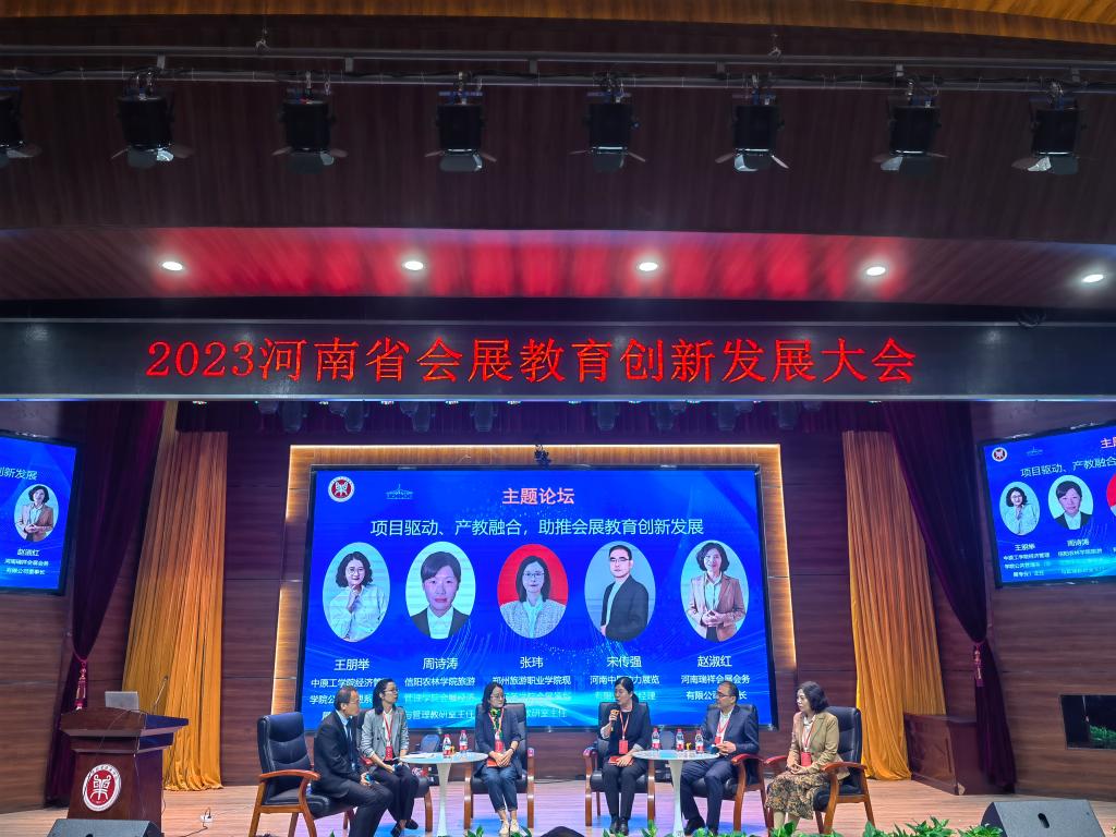在随后的主题论坛环节,特邀中原工学院经济管理学院公共关系(会展专业)主任王朋举博士、信阳农林学院旅游管理学院会展教研室主任周诗涛副教授、郑州旅游职业学院现代服务学院会展教研室主任张玮老师、河南中展动力展览有限公司总经理宋传强、河南瑞祥会展会务有限公司董事长赵淑红围绕项目驱动、产教融合、校企合作、实习就业、师资培养、项目开发等展开校企对话和深度研讨。