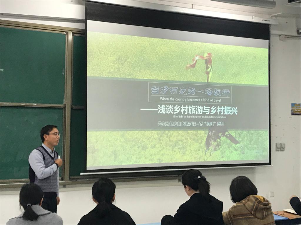 张行之院长以陶渊明《归园田居》开篇,从“我本将心向明月,奈何造化不由人——初心”、“清风知我意,无事也翻书——动心”、“白发思益壮,心玄用弥拙——用心”、“我心一片磁铁针,不指南方不肯休——真心”和“采菊东篱下,悠然见南山——归心”等五个方面进行精彩分享,让大家领略了独具风格的乡村之旅。张院长结合实际案例向beat365在线体育官网登录入口师生介绍乡村旅游规划的战略选择,如以品牌创建为发展树立典型的安徽颍上八里河、以品牌创作为特色产业赋能的重庆武隆白马山、以文化创新为民俗传承铺路的云南贡山独龙江。张院长指出旅游规划的核心是为了解决实际问题,乡村旅游规划就是要结合吸引物、产品、组织和故事等核心要素,在故乡的沃土中植入一粒种子让它生根发芽,在乡村振兴中开花结果。