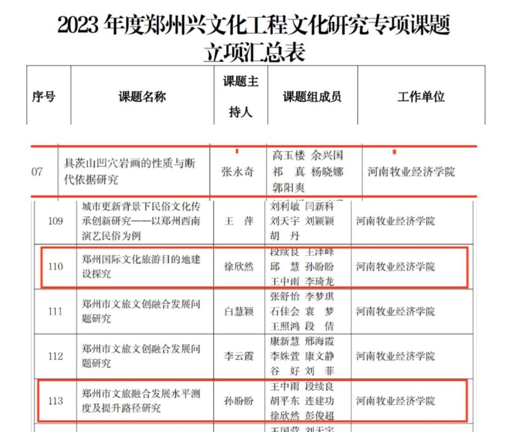 根据《关于申报2023年度郑州兴文化工程文化研究专项课题的通知》文件要求,beat365科研办积极组织学院教师根据自身研究方向进行申报工作,并对有意向申报的老师一对一开展申报指南解读,最终张永奇、徐欣然、孙盼盼三名教师通过个人申报、科技处资料审核、专家评审等环节,喜获2023年度郑州兴文化工程文化研究专项课题立项。