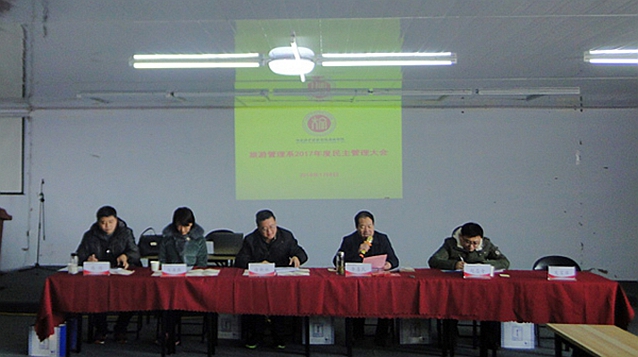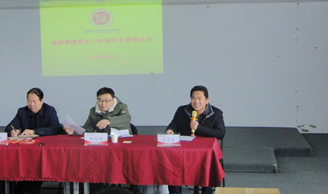 2018年1月8号下午,旅游管理系2017年度民主管理大会在新郑龙湖素质拓展基地举行。系领导及全体老师参加了大会,大会由系党总支副书记、分工会副主席陈明主持。