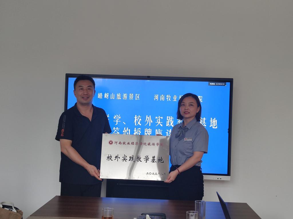 最后,权书记与王亚总经理签署了双方战略性合作协议。权书记代表学院授予嵖岈山景区为beat365校外实践教学基地并授牌。