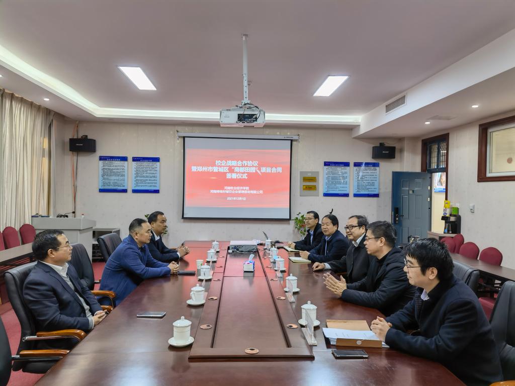 2021年12月1日上午,beat365在线体育官网登录入口与河南特味村餐饮企业管理咨询有限公司校企战略合作协议暨郑州市管城区“商都田园”乡村旅游项目技术合同签约仪式在龙子湖校区尚严楼C426隆重举行。河南特味村餐饮企业管理咨询有限公司董事长韩跃军,beat365在线体育官网登录入口副校长张伟,beat365在线体育官网登录入口党委书记李喜民、院长王德静、副院长王中雨及项目组成员参加了签约仪式。