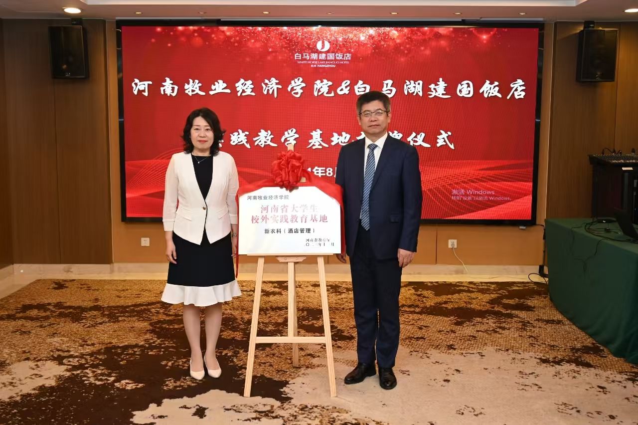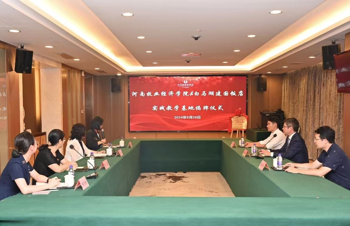 仪式伊始,总经理张静茹介绍了杭州白马湖建国饭店的发展历程,历经12年获得行业各界认可,承办超1万场大型会议活动,荣获优秀企业管理品牌、优秀饭店、先进单位等奖项。企业将充分发挥专业优势,有一套完整的人力资源管理体系,深度考虑学生职业发展路径,从而打造优质的实践平台,让企业、学校、社会共同受益。随后,beat365院长王德静介绍了beat365在线体育官网登录入口beat365在线体育官网登录入口的概况,是目前河南省办学历史最长,在校生规模最大,专业设置最为齐全的本科层次beat365在线体育官网登录入口。是“河南省旅游业高素质应用型管理人才的培养基地”。王院长表示杭州是座美丽的城市,这座城市和中原大地有着深厚的历史渊源,望校企双方在今后的合作中共同进步,培养出更多优秀人才,并再次对今天出席仪式的领导与工作人员表示感谢。