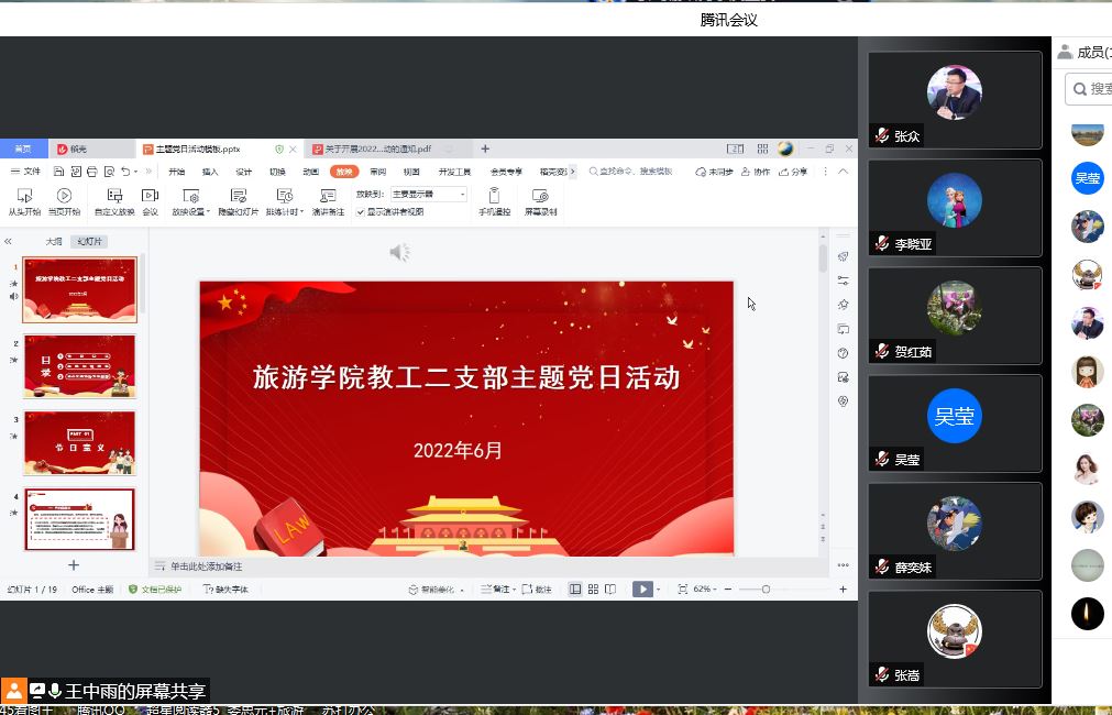6月16日中午,beat365在线体育官网登录入口教工二支部在腾讯会议平台,开展线上主题党日活动。会议由支部书记王中雨主持,支部全体党员参加。