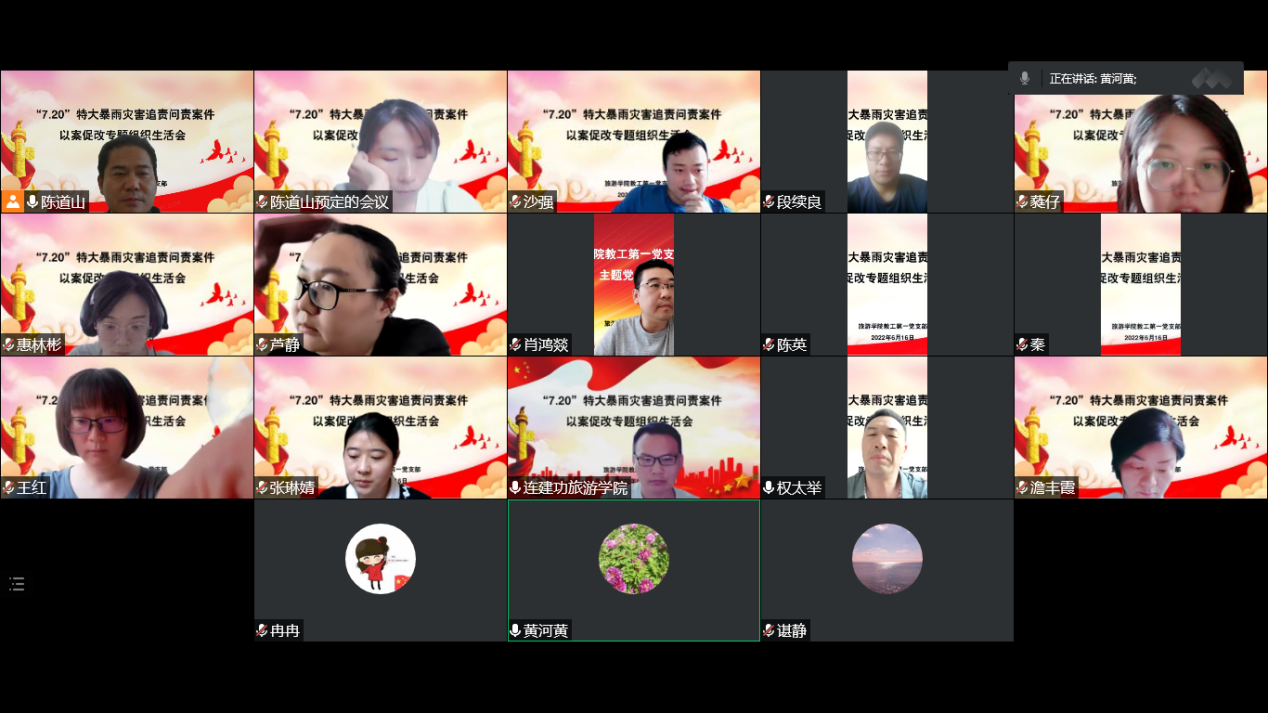 6月16日下午,旅游学院教工第一党支部利用腾讯会议召开“7·20”特大暴雨灾害追责问责案件“以案促改”专题组织生活会,支部全体党员参加了会议,权太举书记以普通党员身份参加会议由支部书记陈道山主持。