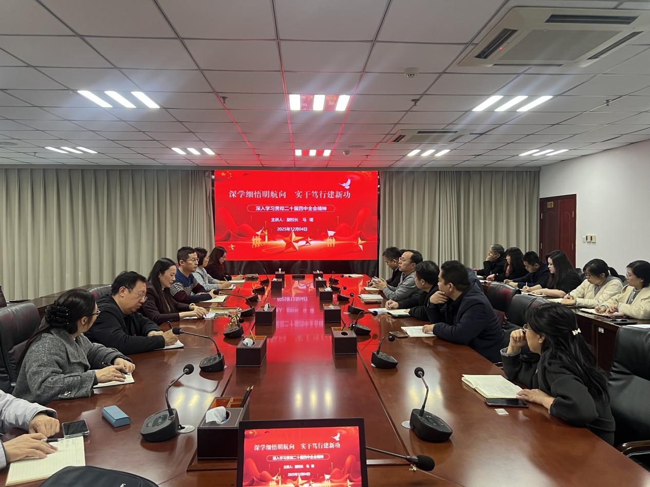 12月4日下午,龙子湖图书馆841会议室,副校长马珺为分管部门全体中层干部作深入学习贯彻党的二十届四中全会精神报告。会议围绕深刻领悟全会的历史意义、理论贡献、战略部署以及实践要求这四个方面,展开了深入学习。