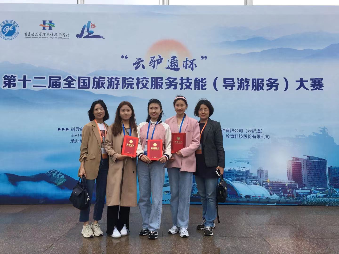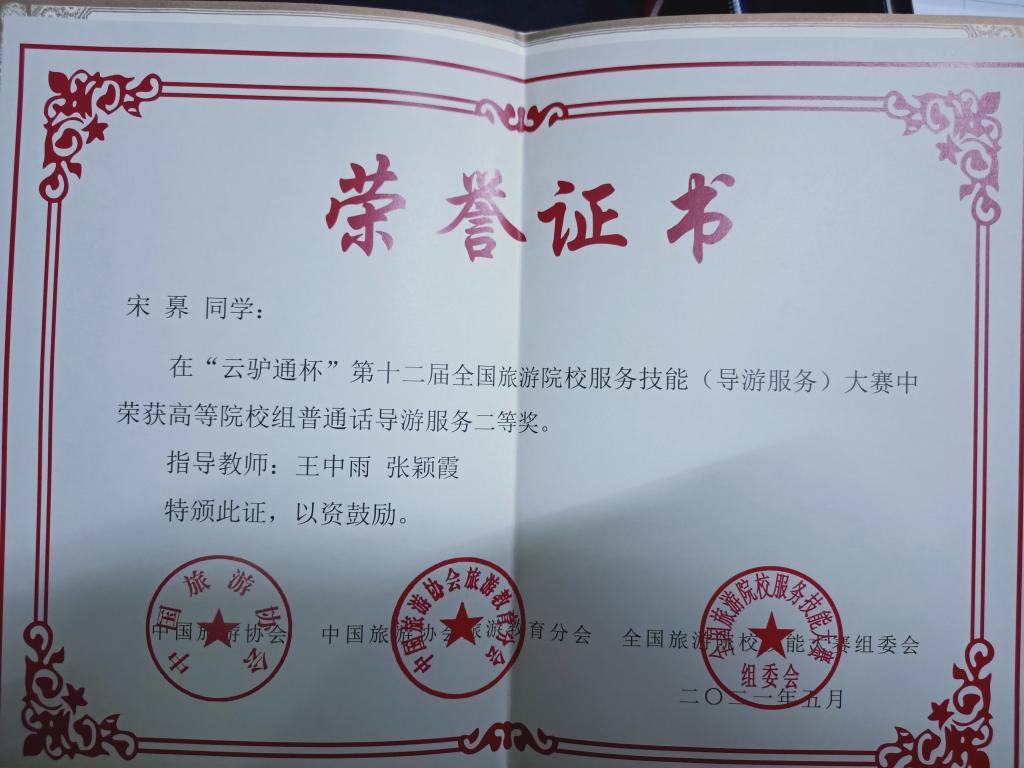 5月16日,“云驴通杯”第十二届全国旅游院校服务技能(导游服务)大赛在青岛酒店管理职业技术学校落下帷幕。beat365派出3名参赛选手参加了高校普通话组和英语组的比赛。经过四天紧张而激烈的角逐,beat365参赛选手成绩喜人,其中:宋奡获高校(普通话组)二等奖、刘梦云(普通话组)和苗梦晓(英语组)获三等奖的好成绩。