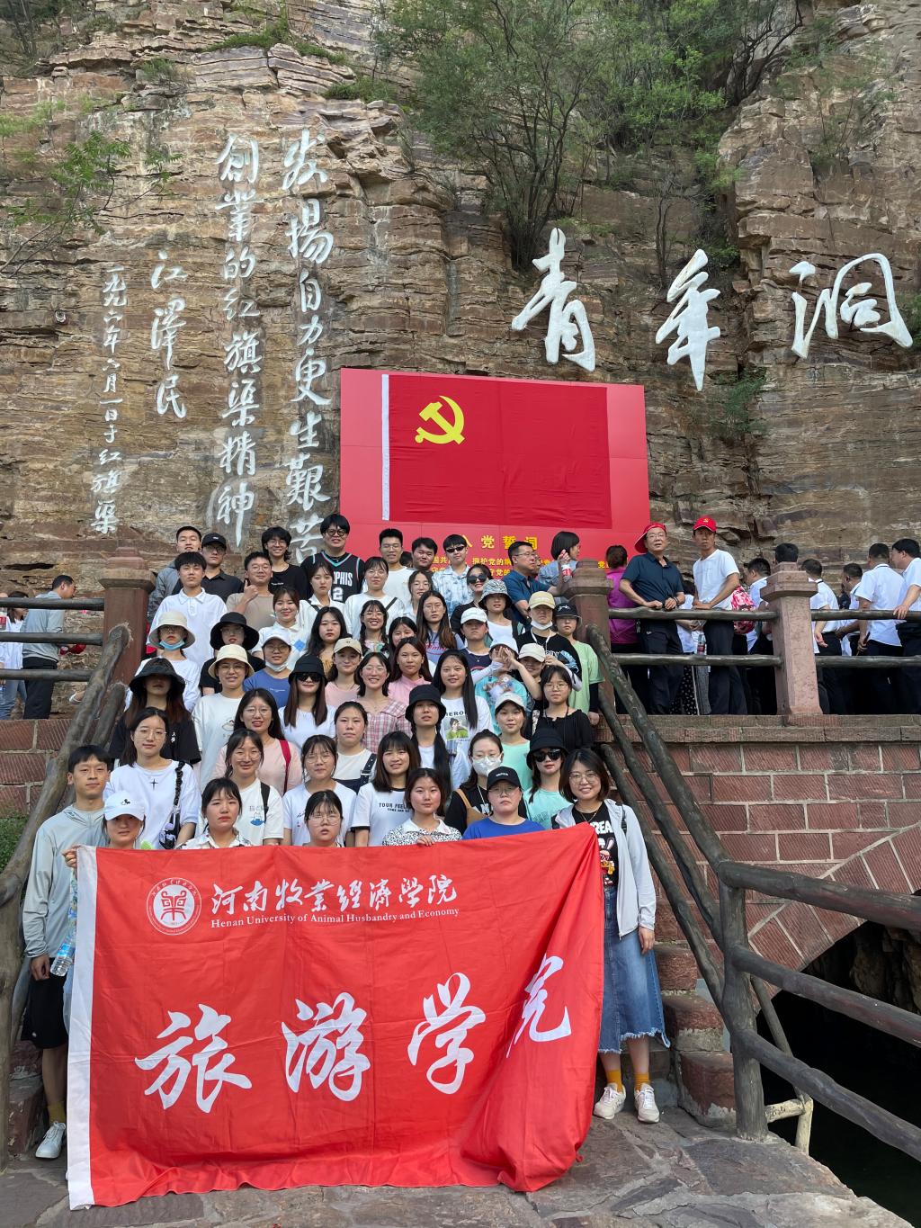 经过近四个小时车程,我们到达红旗渠纪念馆、青年洞等地进行实地考察与学习,随着涌动的人潮参观各个展区,进一步了解数万林州先辈的那段壮烈历史。听着导游的解说,感受橱窗里粗糙简陋的工具和深厚的历史资料,身临悬挂在巍峨雄峙的太行山悬崖绝壁之上、八米宽的红旗渠从山中穿过,同学们更加深入了解了广大林州先辈们即使身处艰险的环境中,改造自然的奋斗历程,更加深刻感悟薪火相传、勇为先锋、身体力行的红旗渠精神。