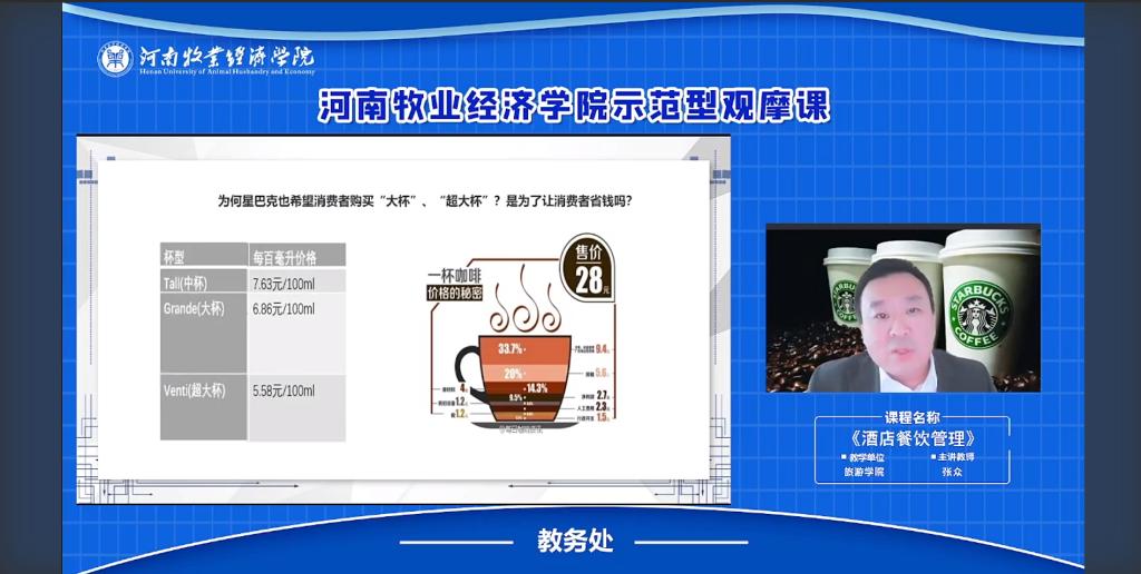 张众老师主要讲解的内容是餐饮营销策略。开课前以“自古真情留不住,唯有套路得人心”的诙谐说法,引人入胜。他熟练利用网络教学平台发布课程前测,引导学生温故知新。以“星巴克”案例导入新课,并充分体现以“学生为中心”的教学理念,激发学生积极性。学生热情高涨,纷纷以短视频形式进行分享,主动思考问题并踊跃回答。随后,由学生思考的结果引入产品定价、国内外餐饮品牌的定价、顾客的感知-期望等教学内容。最终提出营销“套路”究竟是什么,何为营销策略。在授课过程中,结合文化自信进行课程思政教育,衔接自然,教学效果非常好。