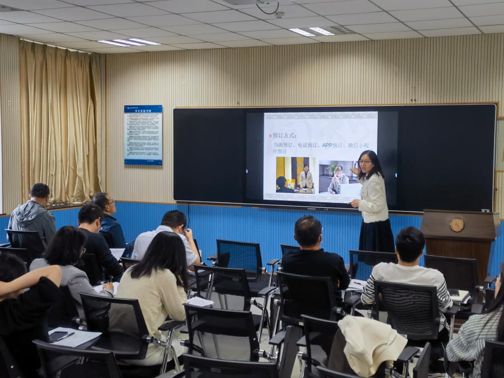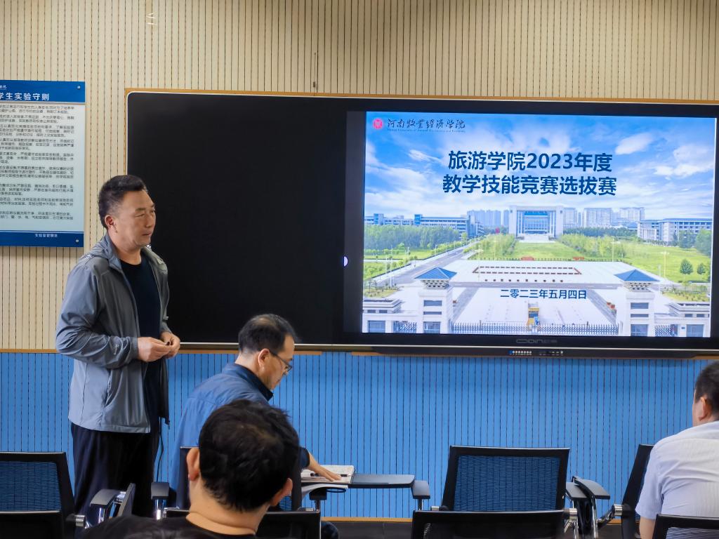 5月4日下午14:30,beat365在线体育官网登录入口于C617旅游模拟实训室举行2023 年度教师教学技能暨课堂教学创新大赛选拔赛,经过教师个人自愿报名和教研室遴选,7名专业教师参加了本次比赛,学院组织9名高职称高水平评委老师对各参赛老师依次进行了无记名打分评定和总结点评。学院全体教师全程参与并观摩了本次大赛,比赛由王中雨副院长主持,权太举书记出席并进行总结讲话。