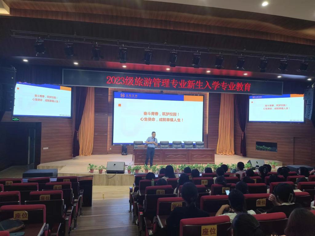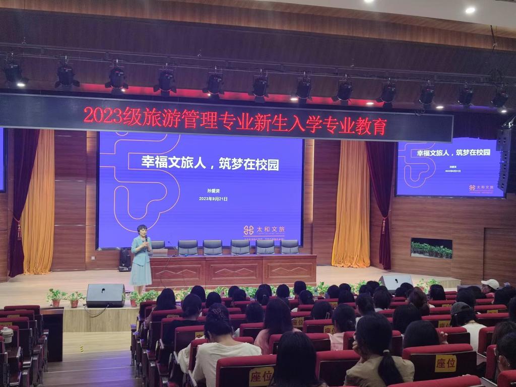 会上,beat365在线体育官网登录入口教学副院长王中雨首先向新生做欢迎致辞,对太和文旅集团应邀参加专业教育表示感谢,并向同学们介绍了beat365旅游管理专业特色、发展历程和取得成果。随后,太和文旅集团人力运营总监李虎、beat365优秀校友代表孙爱灵经理做了《幸福文旅人,筑梦在校园》的主题讲座,结合多年的文旅行业从业经验,为同学们介绍了旅游行业相关文旅政策、发展现状及前景和专业岗位人才需求。最后,旅游管理教研室主任甄莎重点讲解了旅游管理专业人才培养方案、实践教学体系、专业学习方法等。