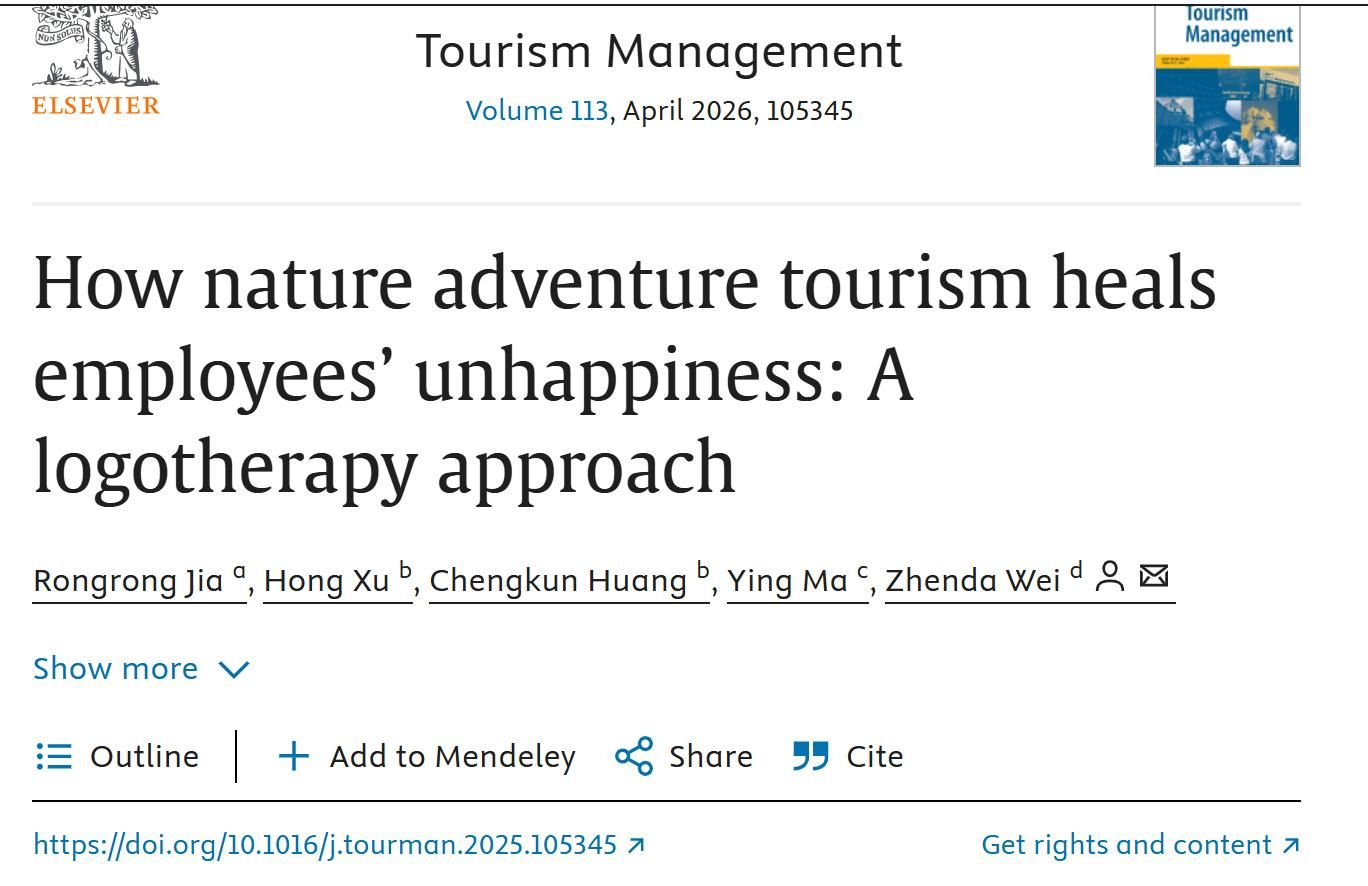 近日,旅游管理学科国际三大顶尖期刊之一的《Tourism Management》(影响因子IF=12.4, 引用指数CiteScore=26.5)接收并发表了beat365贾榕榕老师作为第一作者、南开大学旅游与服务学院徐虹教授团队、聊城大学魏振达博士合作完成的研究成果《How nature adventure tourism heals employees’ unhappiness: A logotherapy approach》。