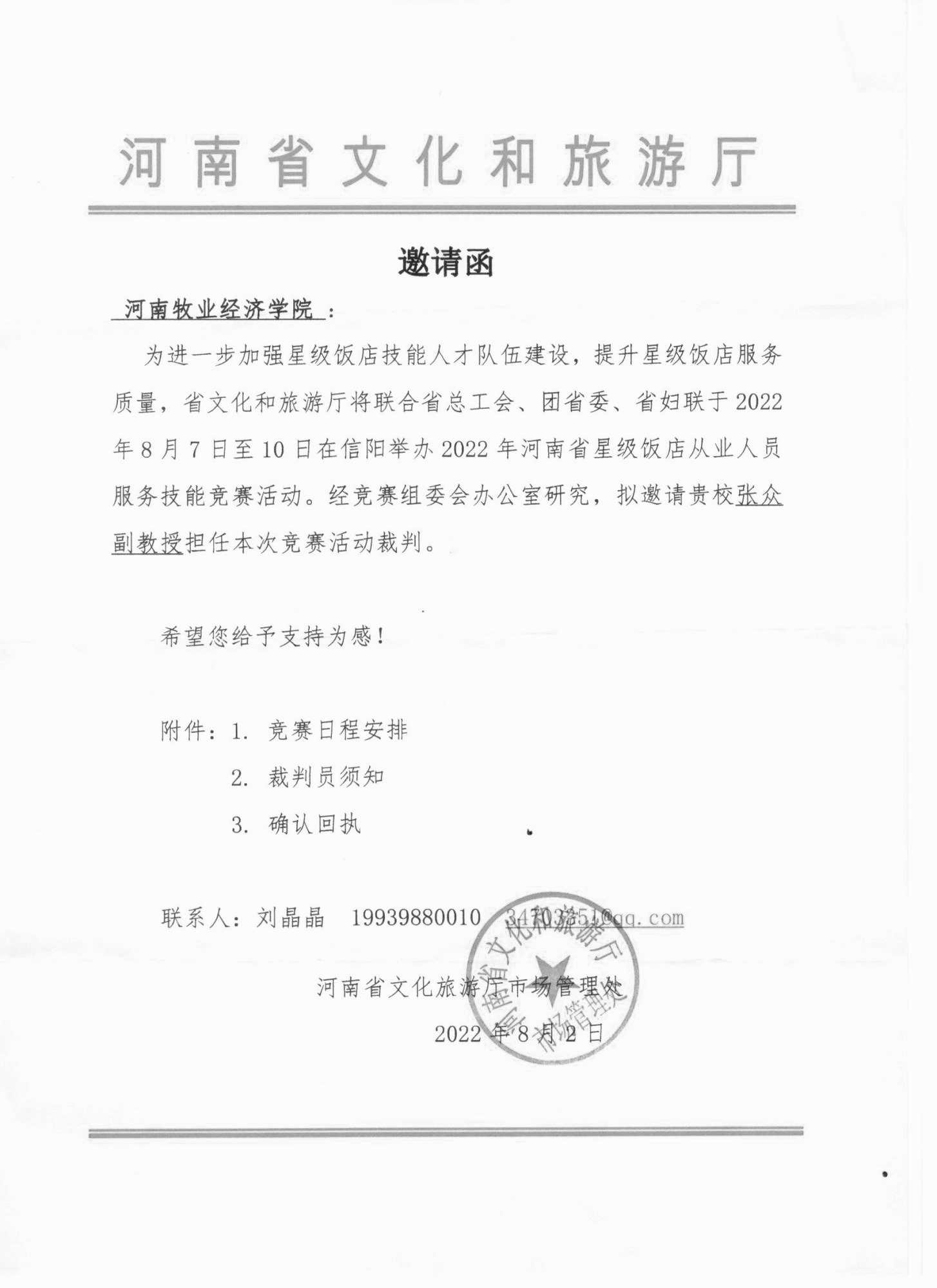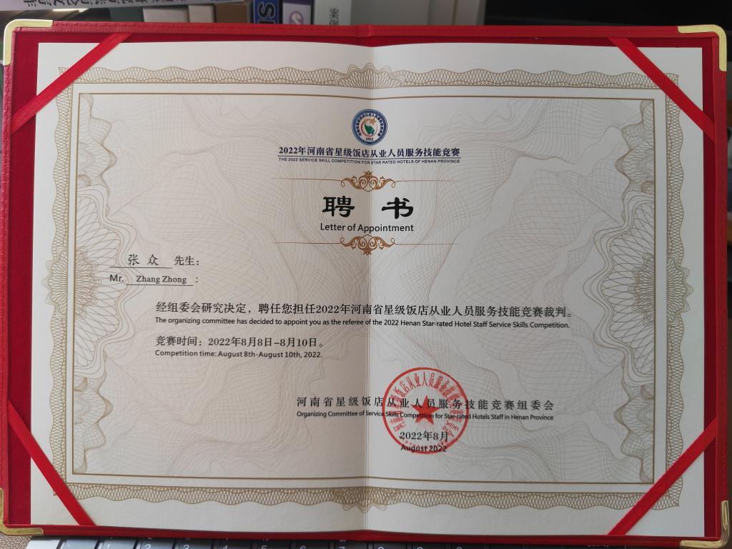近日,beat365张众副教授受河南省文化和旅游厅邀请,在刚刚结束的2022年河南省星级饭店从业人员服务技能竞赛中担任裁判员,圆满完成大赛执裁任务。
