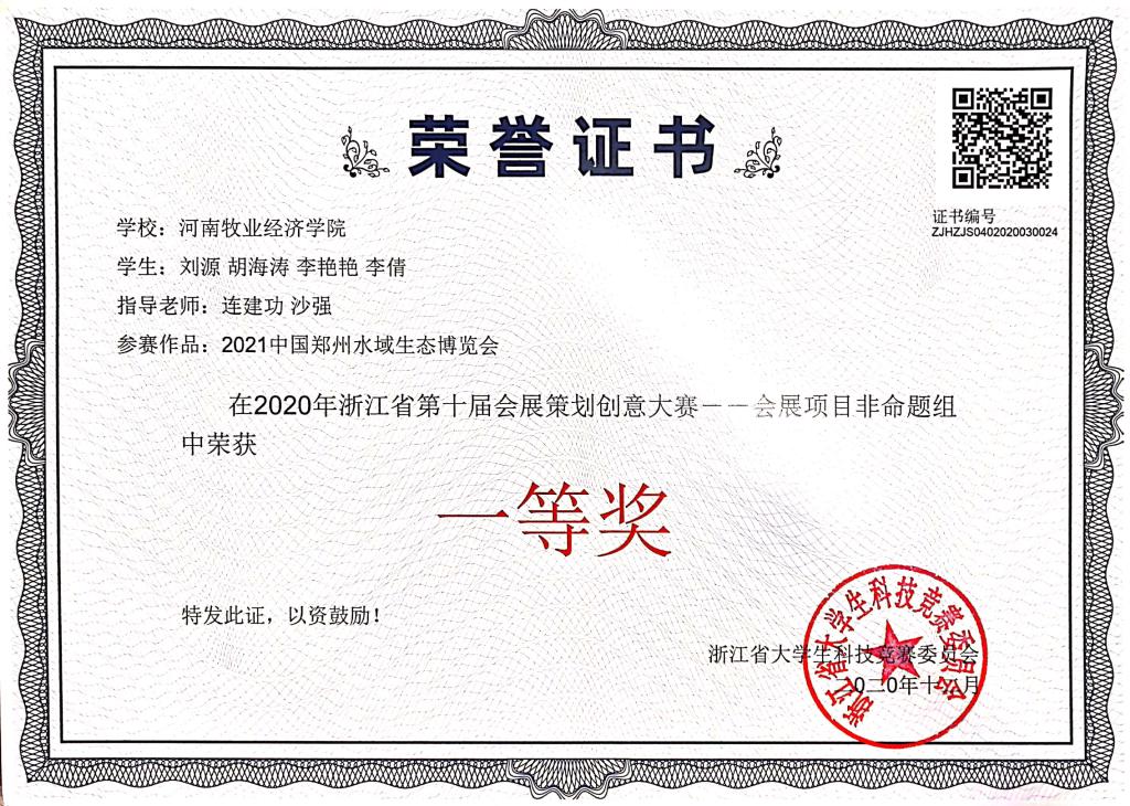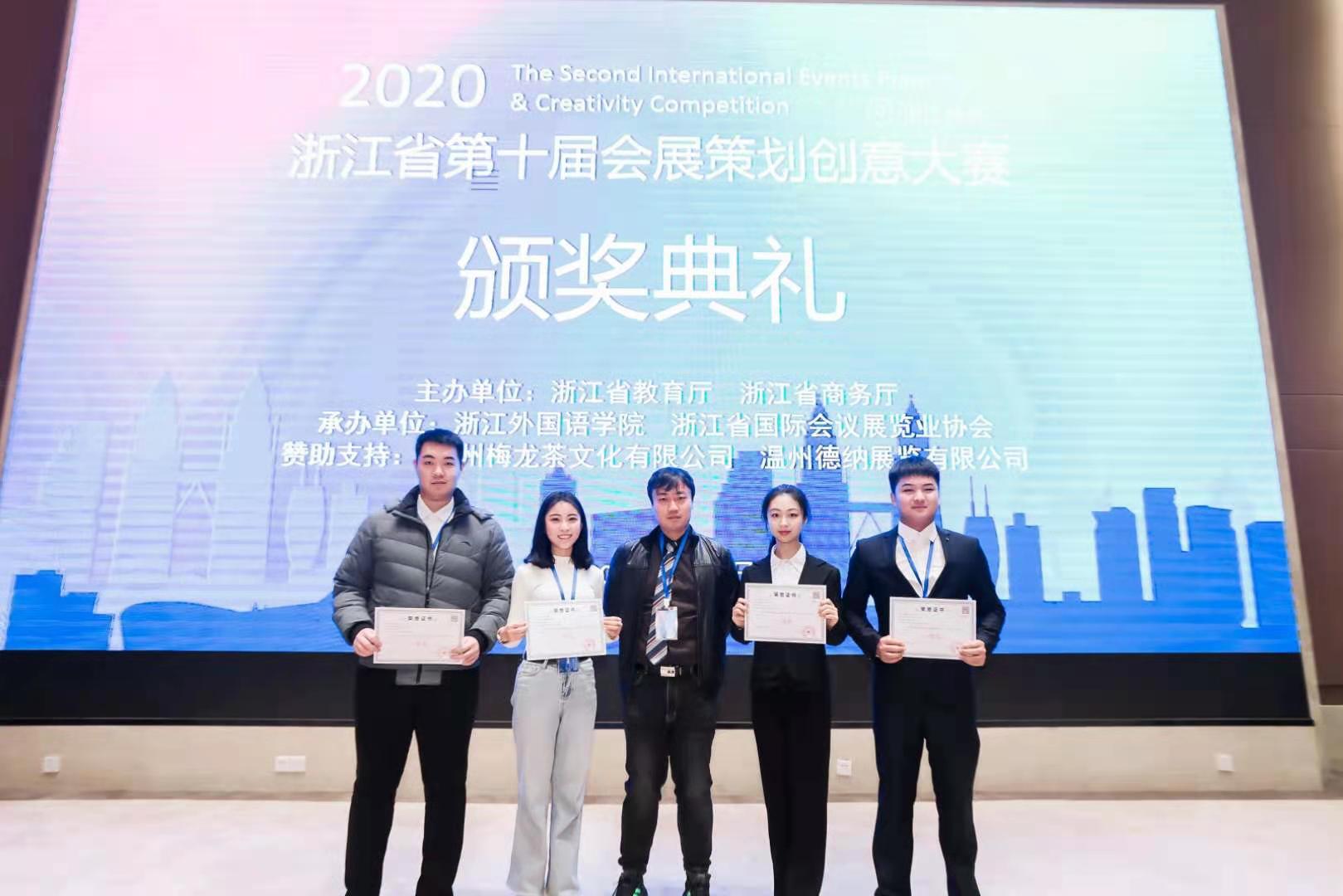 2020年12月18日,由浙江省教育厅和浙江省商务厅共同主办,浙江外国语学院和浙江省国际会议展览业协会共同承办的2020第十届浙江省会展策划创意大赛颁奖典礼在杭州浙江外国语学院举行。beat365beat365在线体育官网登录入口推荐的《2021中国郑州水域生态博览会》项目荣获非命题组一等奖,沙强博士携项目团队成员刘源、胡海涛、李倩、李艳艳4位同学参加颁奖典礼。