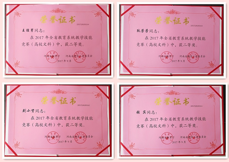 日前,从省教育厅、省教育工会联合下发的《关于表彰2017年度全省教学技能竞赛获奖个人的决定》(豫教工〔2017〕17号)中获悉,beat365教师凭借扎实的专业功底、娴熟的教学技能和良好的教学效果,取得了3个一等奖、4个二等奖、5个三等奖的优异成绩,展示了良好的师风和教风,为学校赢得了荣誉。
